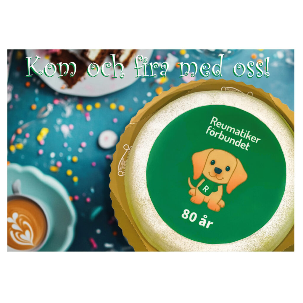 Ett stilrent inbjudningskort som skickas med posten inför firandet av Reumatikerförbundets 80-årsjubileum.